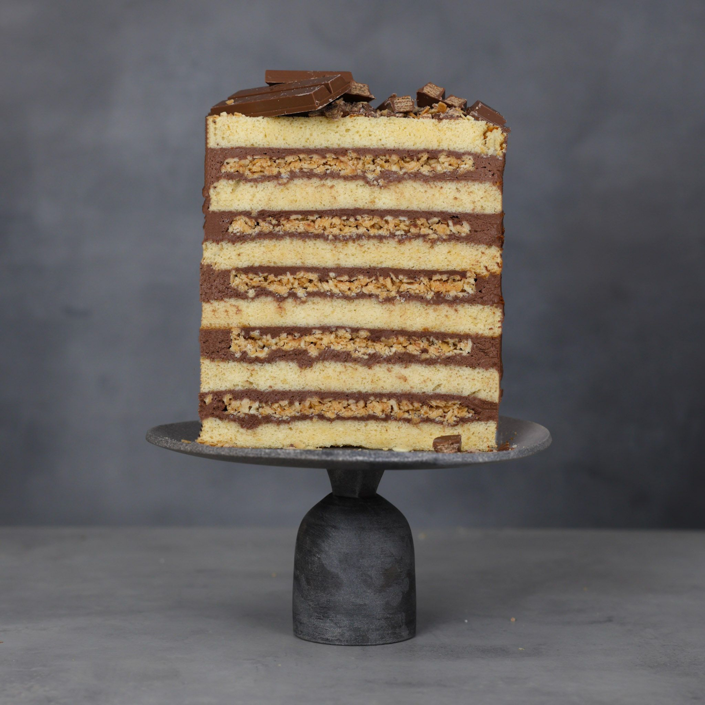 A rich chocolate sponge layered with creamy filling and crispy KitKat crunch for the perfect bite of nostalgia.