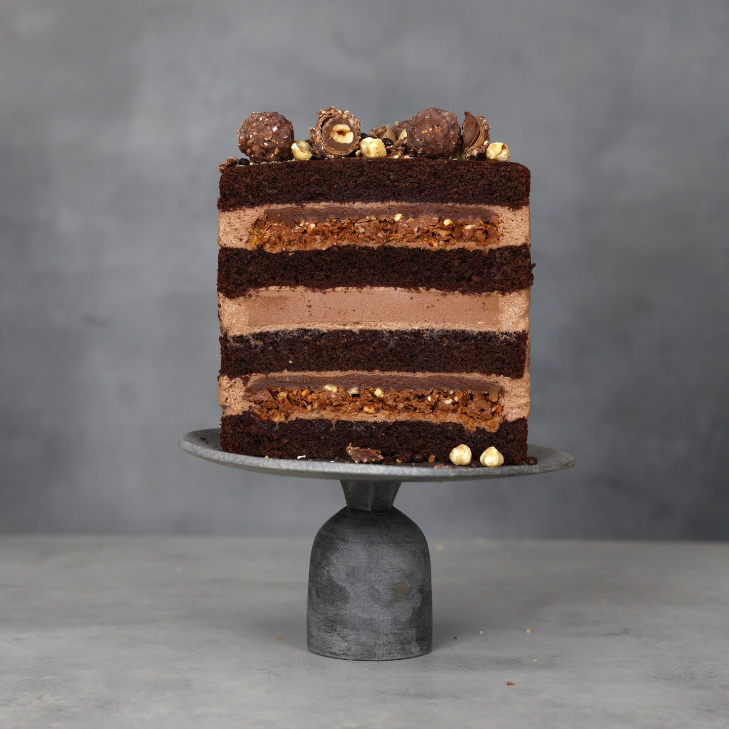 A decadent hazelnut mousse and praline crunch cake inspired by everyone’s favourite golden chocolate.