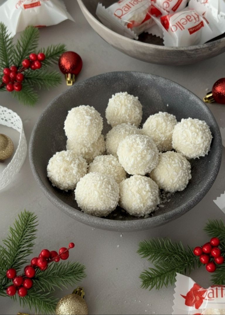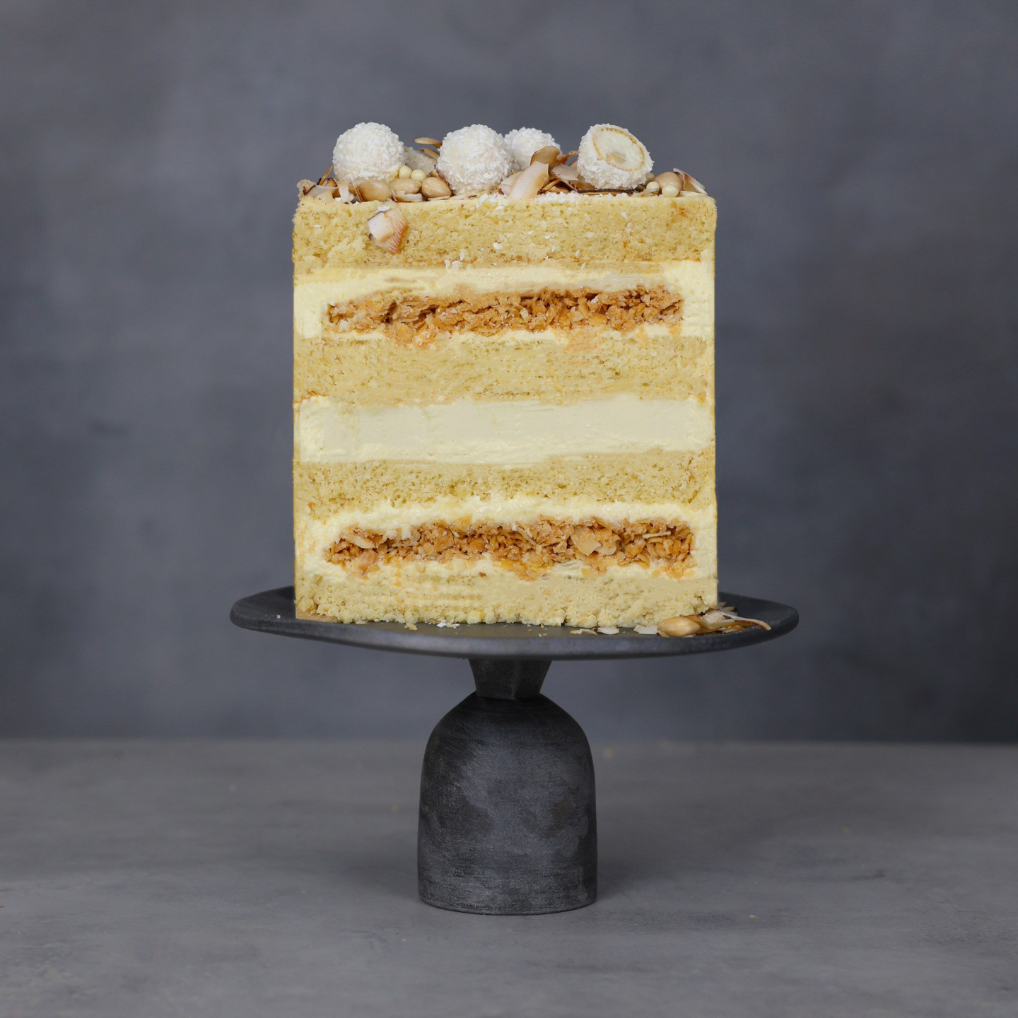 Light coconut mousse, almond crunch, and creamy layers reminiscent of the elegant Raffaello treat.
