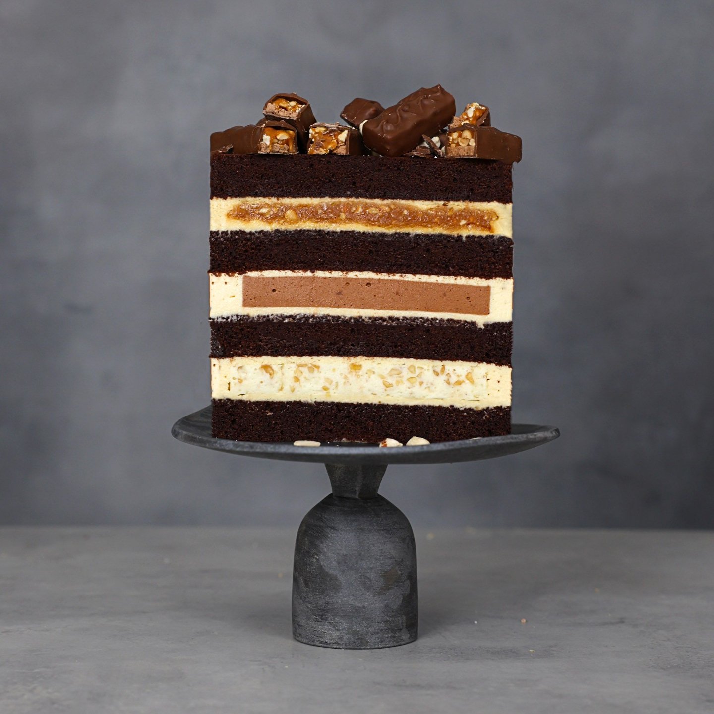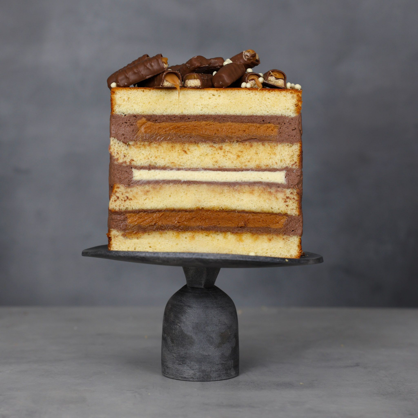 Layers of chocolate sponge, caramel, and peanut butter cream that capture the irresistible Snickers flavour.