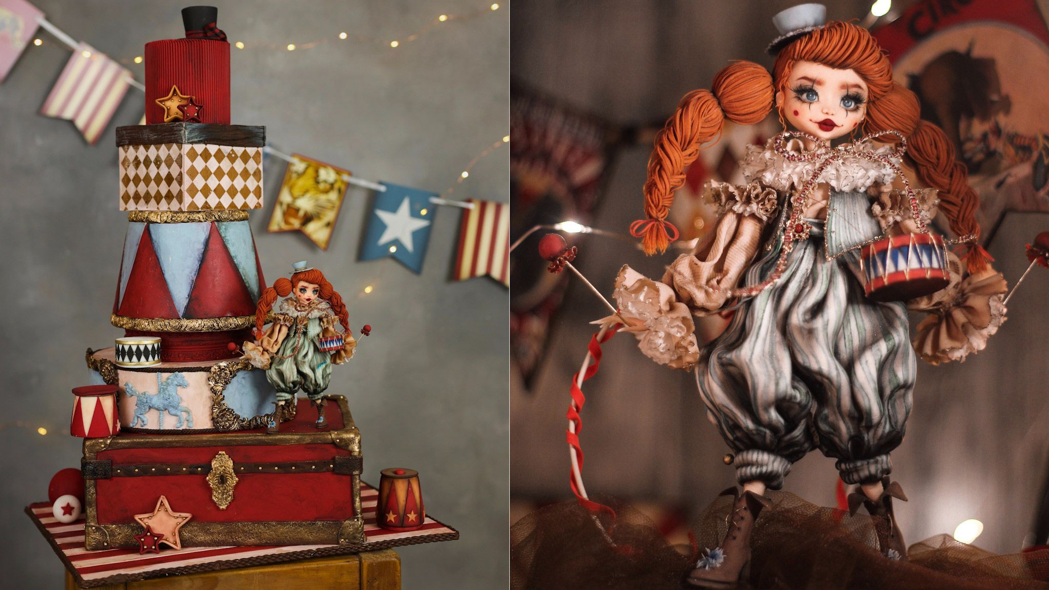 Craft a vintage circus cake and create charming sugar clownette and toy figurines